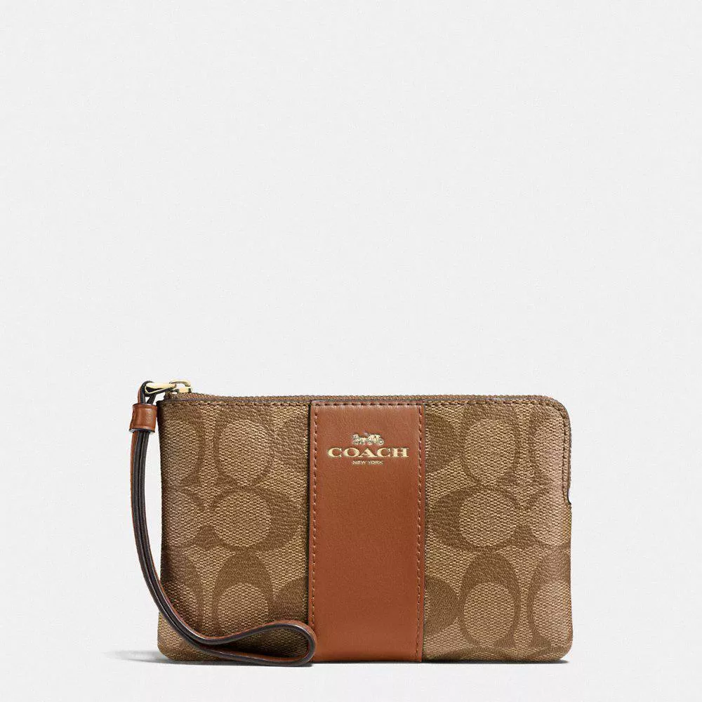 Coach Corner Zip Wristlet in Signature Canvas in Khaki/Saddle 2