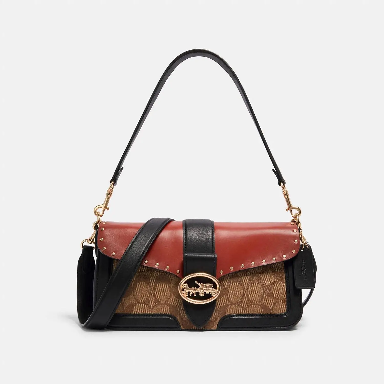 (Pre Order) Coach Georgie Shoulder Bag in Colorblock Signature Canvas With Rivets in Khaki/Terracotta Multi (5605)